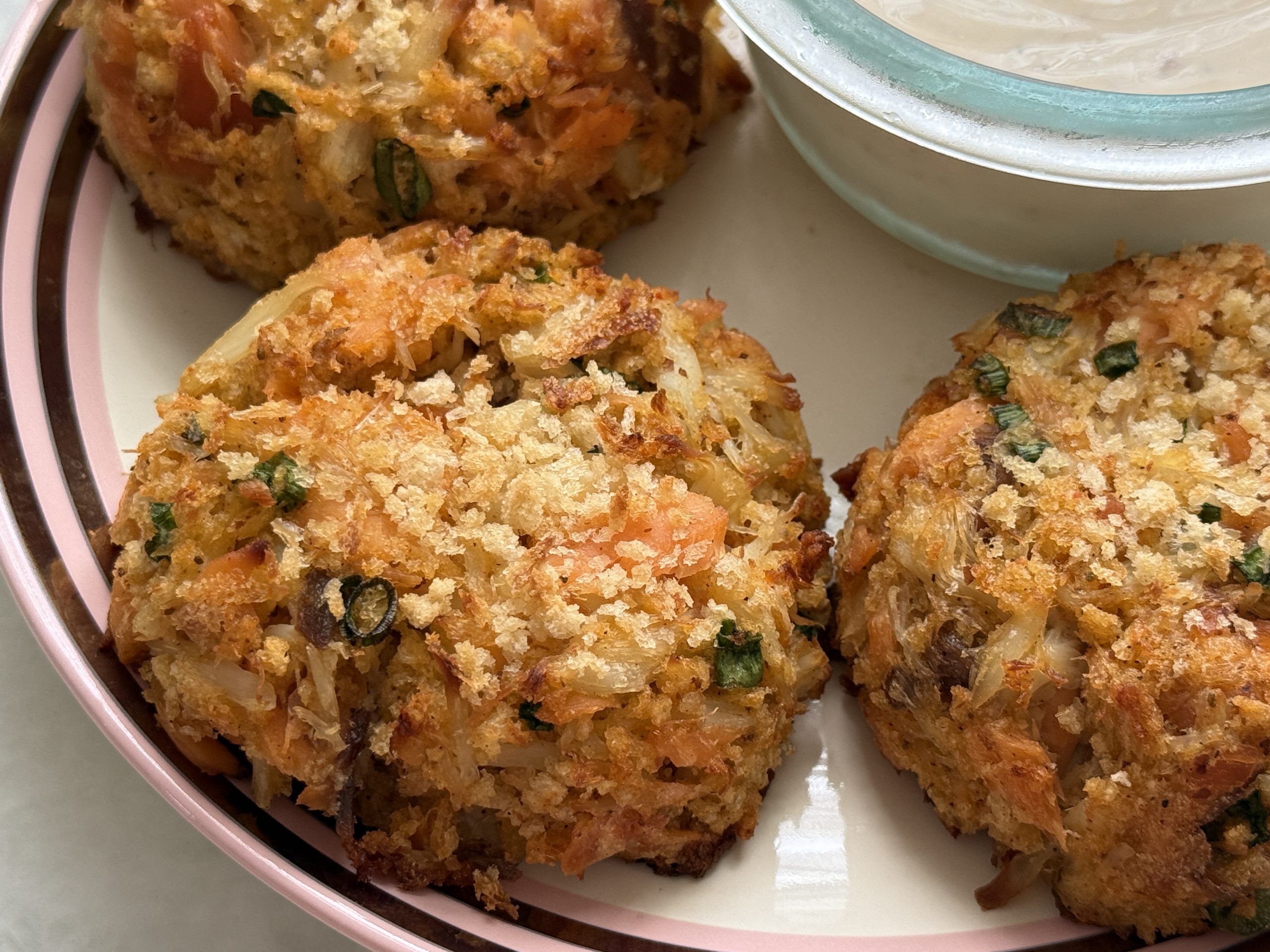Remove salmon skin and break into medium chunks. Add salmon, crab, scallions, and ½ cup panko. Gently mix, keeping crab pieces intact.